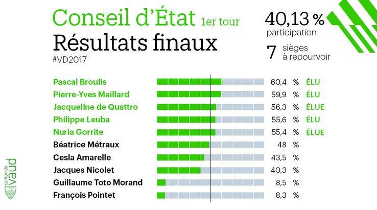 Pascal Broulis (60.42%), Pierre-Yves Maillard (59.90%), Jacqueline de Quattro (56.39%), Philippe Leuba (55.67%), et Nuria Gorrite (55.43%) sont élus à l'issue de ce premier tour.