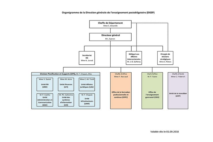 À l’issue de cette démarche, le DFJC a décidé la création, au sein de la DGEP, de deux nouveaux Offices: l’Office de la formation professionnelle et continue (OFPC) à la tête duquel sera placée Mme Fabienne Raccaud; et l’Office de l’enseignement gymnasial (OEG), avec à sa tête M. Pierre Faoro. La thématique de la transition et les missions qui lui sont rattachées seront regroupées au sein d’une Unité éponyme (Unité de la Transition / UDT), directement rattachée au Directeur général.