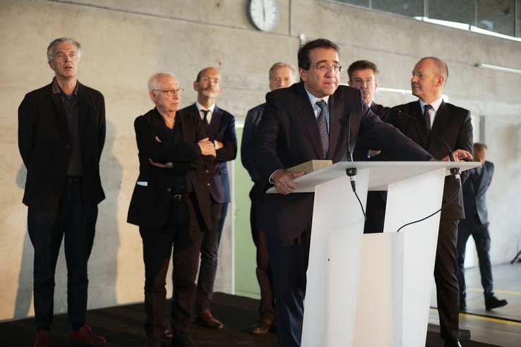 Accompagné à la remise du trophée par le chef du SIPAL Philippe Pont et l’architecte cantonal Emmanuel Ventura, le conseiller d’Etat souligne que cette distinction est une récompense pour le travail réalisé par l’ensemble du Service avec le souci permanent, conformément au 5ème pilier de la Stratégie immobilière du canton, de promouvoir une architecture exemplaire.