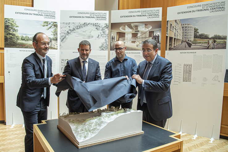 Le Jury du concours d’architecture et d’ingénierie pour l’extension du Tribunal cantonal s’est déterminé en faveur du projet baptisé "Une ammonite dans la prairie". Il propose d’adjoindre un nouveau bâtiment cylindrique à l’extrémité sud-est de la façade actuelle.