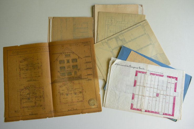 Aujourd'hui, j’ai sorti de nos étagères mobiles, les plans d’un bâtiment de douane situé dans un village du Haut-Valais à Gondo (VS), un village qui accueille donc un poste de douane (CH-IT). Il y avait un projet d’agrandissement de ce bâtiment. Ce document met en scène deux pôles d’intérêts d’André Rapin : les douanes et l'architecture. Son fonds contient énormément de plans.