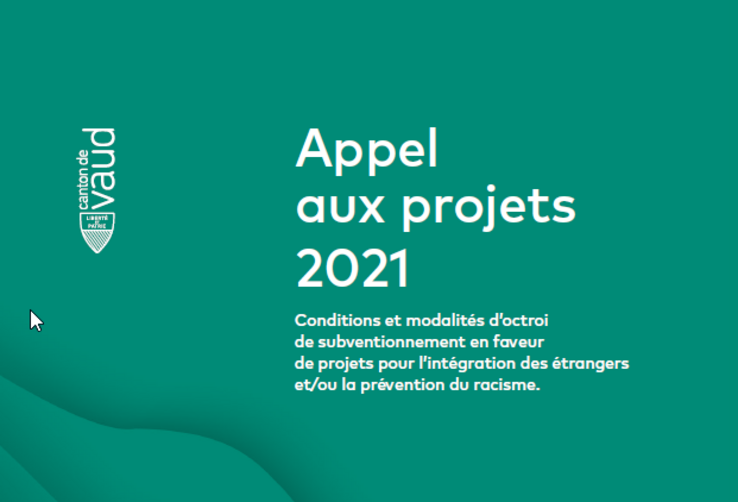 Les modalités et conditions d’octroi de subventionnement relatives aux différents domaines sont regroupées dans la brochure « Appel aux projets 2021 ». Cette publication contient également de nombreux conseils pratiques afin d’accompagner les porteurs de projet dans leur démarche. La brochure, les formulaires, ainsi que toutes les informations relatives au dépôt de projet sont disponibles sur le site cantonal à l’adresse : www.vd.ch/projets-integration.