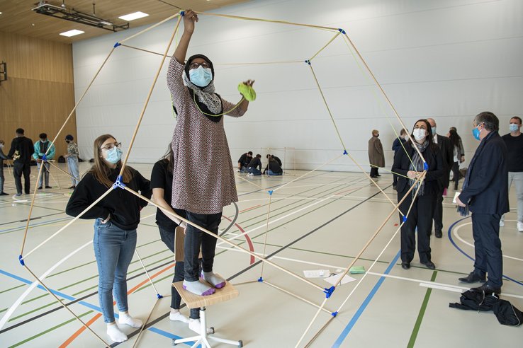 Dans cette perspective, la conseillère d’État a assisté ce lundi à un de ces cours facultatifs donnés dans l’établissement de Renens à une dizaine d’élèves de 10e année. Dans ce cours, il s’agit d’appréhender la géométrie spatiale en utilisant des structures qui permettent aux élèves de construire “en grand” et de manière collaborative des formes de plusieurs mètres de haut et de large. Une autre manière d'aborder une discipline souvent cantonnée à la simple page A4 et au dessin. Avec ces expériences, les élèves peuvent identifier, comprendre les propriétés des objets géométriques et accéder plus facilement à l’abstraction (des photos sont à disposition sur demande).