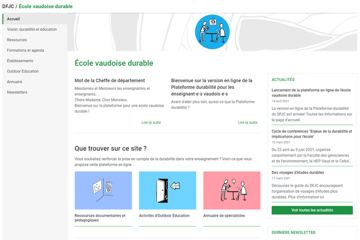 Pour concrétiser ce plan d’action, le DFJC a déposé une demande de crédit d’investissement de 7 millions au Grand Conseil. Cette demande fait partie du Plan climat cantonal et a été retenue par le Conseil d’État dans l’accompagnement au changement de la société face aux enjeux climatiques. En attendant et pour soutenir le corps enseignant, la plateforme ecolevaudoisedurable.ch est mise en ligne dès ce 14 avril. Elle vise à faciliter l’accès à des informations et des ressources qui permettent de renforcer l’éducation à la durabilité dans toutes les disciplines et les niveaux scolaires. La plateforme a été réalisée à la suite d’un sondage des enseignantes et enseignants entre 2019 et 2020. On pourra également y retrouver le guide des voyages d’études durables édité en 2020 à la suite d’une décision du Département de ne plus autoriser les déplacements en avion.