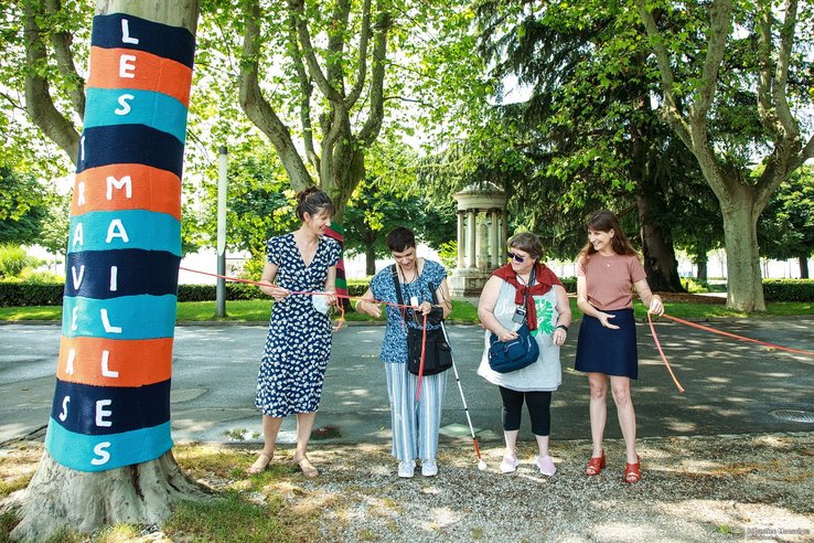 « A travers les mailles » présente des pièces de tricots qui habillent les lampadaires de la Place du Vieux-Port et les arbres de l’allée des Bacounis. Elles ont été réalisées par une soixantaine de personnes de Suisse romande. Cette initiative s’inscrit dans le mouvement lancé par l’organisation Deafblind International : des personnes sourdaveugles et des personnes qui ne sont pas en situation de handicap tricotent des pièces qui seront finalement assemblées pour « habiller » des statues, des monuments, des arbres, des ponts ou des fontaines dans différentes villes de Suisse et d’ailleurs.