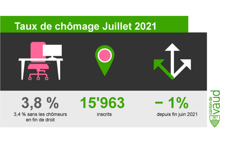 Le taux de chômage dans le canton de Vaud diminue pour le 6ème mois consécutif et s’établit à 3,8 % à la fin du mois de juillet 2021, en baisse de 0,1 point par rapport à fin juin 2021. Ce taux a reculé de 0,8 point en une année puisqu’il s’élevait encore à 4,6 % en juillet 2020.