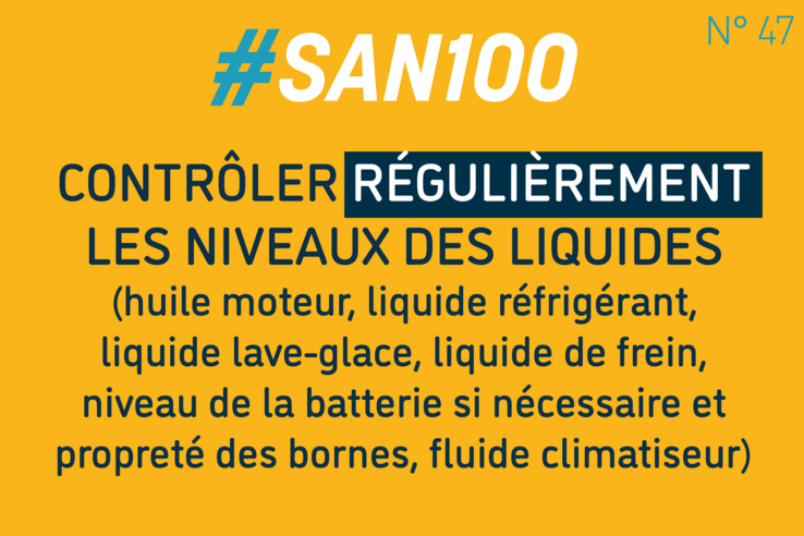 Conseil N° 47 : Niveau des liquidesPublié le 17.10.2021 - Catégorie : san100-conseilsDécouvrez les 100 conseils du SAN pour votre sécurité.Le SAN fête son 100ème anniversaire→ Toutes les informations relatives aux actions déployées