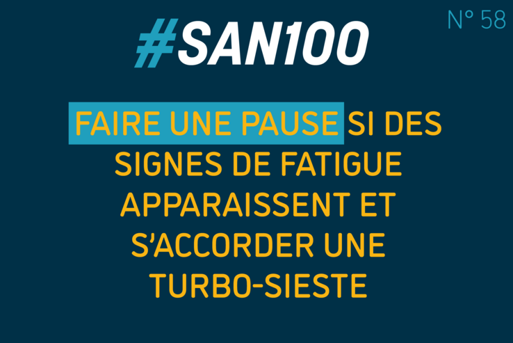 Conseil N° 58 : Une pause !Publié le 28.10.2021 - Catégorie : san100-conseilsDécouvrez les 100 conseils du SAN pour votre sécurité.Le SAN fête son 100ème anniversaire→ Toutes les informations relatives aux actions déployées