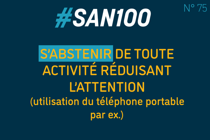 Conseil N° 75 : Toute votre attentionPublié le 14.11.2021 - Catégorie : san100-conseilsDécouvrez les 100 conseils du SAN pour votre sécurité.Le SAN fête son 100ème anniversaire→ Toutes les informations relatives aux actions déployées