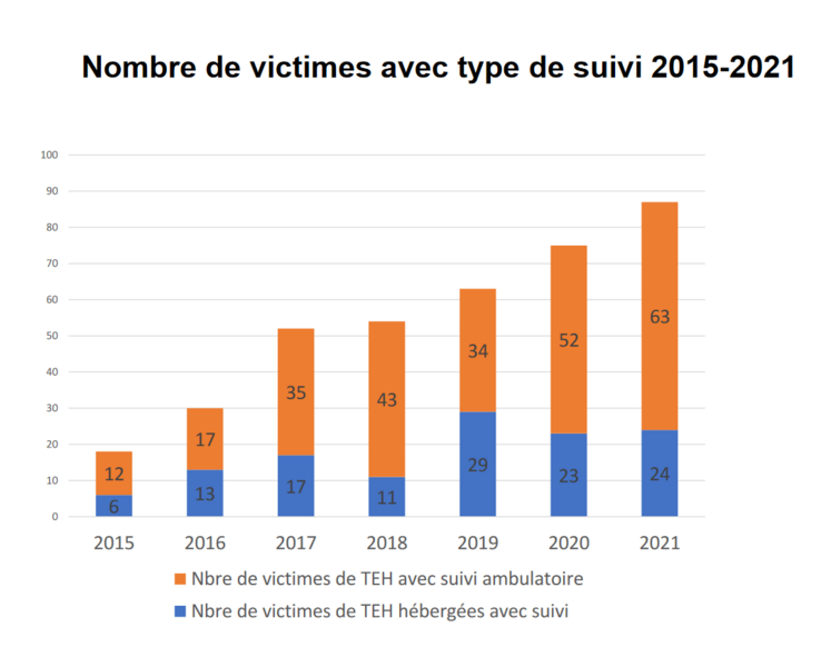 Le bilan de ce dispositif de lutte contre la traite et l’exploitation est très positif. Chaque année, 25 victimes sont détectées dans le canton de Vaud, alors qu’avant la création d’ASTREE, elles n’étaient que 2 à 3 par an. Grâce à cette meilleure détection, le nombre de victimes suivies a également augmenté : En 2021, l’association a mené 2’099 entretiens de suivi (en 2015 : 211) et accompagné 87 victimes (en 2015 : 18 personnes). De 2015 à 2021, 123 victimes ont été hébergées, dont 24 en 2021. « Le nombre de procédures pénales a également augmenté ; il est passé de 5 en 2015 à 46 en 2021. Le fait d’être en sécurité et d’avoir un soutien adapté à leur situation contribue à la décision des victimes de dénoncer les auteurs de la traite », expliquent les deux directrices d’ASTREE, Angela Oriti et Anne Ansermet. Un autre avantage de l’approche intégrée que l’institution applique est que pratiquement toutes les victimes trouvent un logement et sont financièrement indépendantes, une fois que leur suivi prend fin.