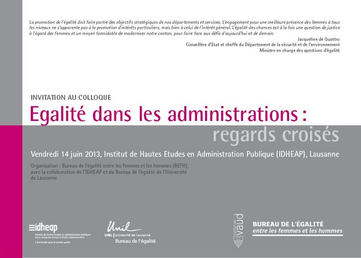 Mis sur pied par le Bureau de l'égalité entre les femmes et les hommes (BEFH) du canton de Vaud, ce colloque est le fruit d’une collaboration entre ce dernier et l’Institut de Hautes études en administration publique et le Bureau de l’égalité de l'Université de Lausanne.