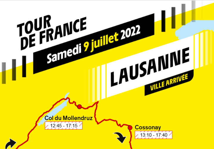 En ce qui concerne Lausanne, ville d’arrivée d’étape du TdF le samedi 9 juillet, les routes seront fermées dès 7h sur l’ensemble du parcours emprunté par les cyclistes; la circulation sur ces artères sera dès lors totalement interdite. Le transit d’est en ouest et inversement ne sera pas possible en ville de Lausanne. Il est recommandé aux Lausannois et Lausannoises d’anticiper ou d’adapter leurs déplacements ce jour-là en fonction de ces fermetures.