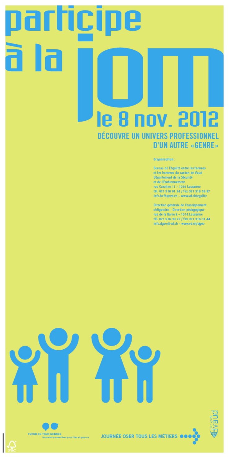 Organisée chaque 2e jeudi de novembre depuis 2003 par le Bureau de l'égalité entre les femmes et les hommes du canton de Vaud en collaboration avec la Direction générale de l'enseignement obligatoire (DGEO), la jom a déjà été suivie par plus de 116'500 enfants. Les élèves qui restent en classe ont eux aussi la possibilité de parler de leurs projets d'avenir et d'échanger sur l'égalité des sexes, notamment grâce aux activités proposées au corps enseignant par la DGEO, au matériel pédagogique "L'école de l'égalité" et aux documents de la mallette "Balayons les clichés".