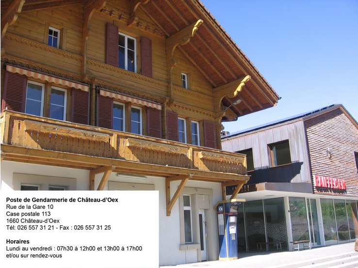 Dès le jeudi 1er octobre 2015, le poste de Gendarmerie de Château-d’Oex se situera à la rue de la Gare 10 à Château-d’Oex. Les horaires restent inchangés.