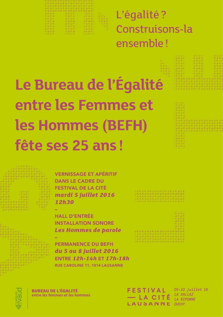 Du 5 au 9 juillet 2016, de 12h00 à 14h00 et de 17h00 à 18h00, les membres de l’équipe du BEFH seront présents pour vous informer et vous accueillir. Venez nombreuses et nombreux au vernissage et durant nos heures de permanence pour découvrir ou redécouvrir les activités du BEFH, nous seront ravi·e·s de vous rencontrer.
