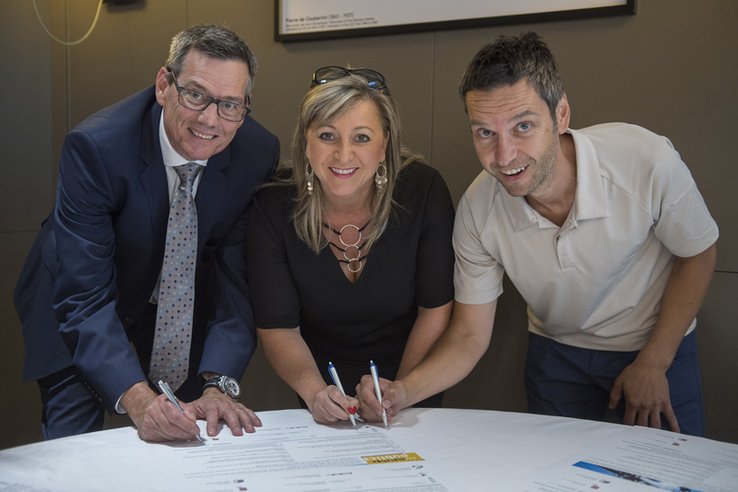 La charte a été signée au Musée olympique par Jean-Marc Demierre, président de la Federation vaudoise des entrepreneurs, Nuria Gorrite, conseillere d'Etat et Pietro Carobbio, secrétaire regional UNIA Vaud. (Photo: Jean-Bernard Sieber ARC)