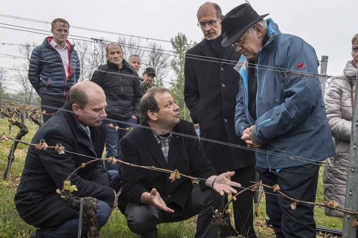 Le gel de ces derniers jours a causé d’importants dégâts dans de nombreux vergers et vignobles en Suisse. Pour prendre la mesure de la situation, le conseiller fédéral et le conseiller d’État se sont rendus chez un viticulteur et un arboriculteur à Constantine et à Cudrefin, en compagnie de représentants des branches concernées.