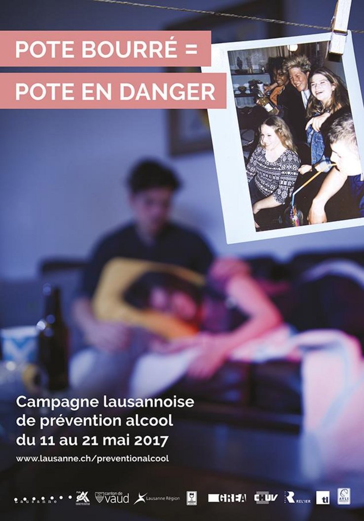 Du 11 au 21 mai 2017, la Ville de Lausanne lance une 2e campagne de prévention « pote bourré = pote en danger » s’adressant aux jeunes de 13 à 17 ans. En marge de la Semaine alcool, organisée par l’Office fédéral de la santé publique, la Ville diffuse un nouveau clip de prévention et met en place avec ses partenaires une série d’actions destinées aux jeunes ainsi qu’aux parents et aux professionnel-le-s de l’éducation.