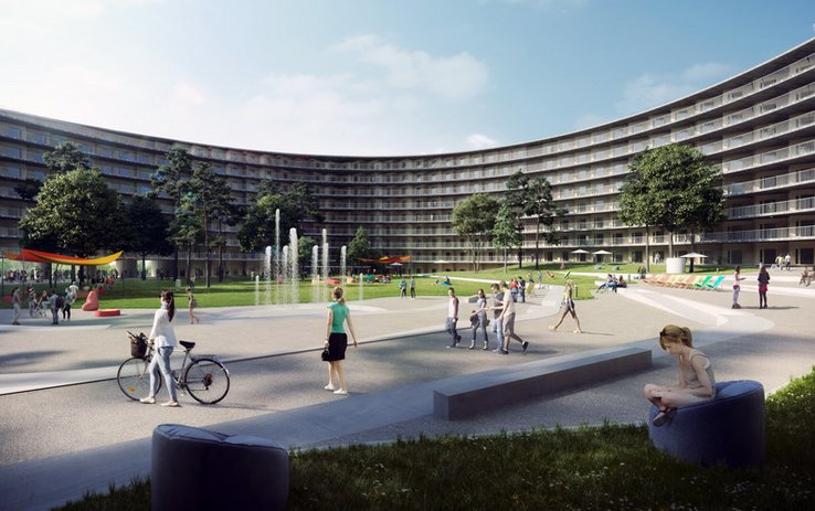 Le bâtiment en forme de couronne circulaire a pour spécificité de se développer le long d’une rampe hélicoïdale longue de 2,8 kilomètres, ce qui représente une hauteur de 27 mètres. En parallèle à cet édifice, la réalisation du pont-passerelle prévu pour désenclaver la parcelle arrivera à son terme dans le courant du mois d’août prochain, un montant de 8 millions de francs ayant été octroyé par l'Etat de Vaud pour sa construction.