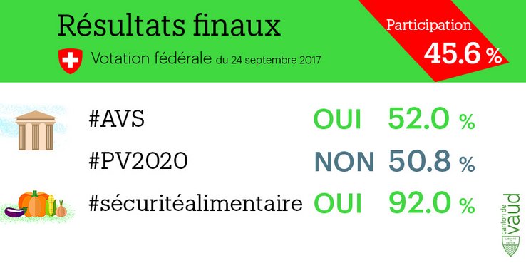 Les Vaudois ont accepté ce dimanche l'arrêté fédéral sur la sécurité alimentaire à 92% de oui. Ils ont accepté le principe du financement additionnel de l'AVS par 52.07% et refusé par 50.89% la réforme de la prévoyance vieillesse 2020.
