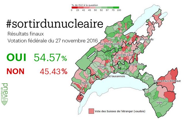 Les Vaudoises et les Vaudois ont voté à 54.57% pour une sortie programmée du nucléaire lors de la votation fédérale de ce dimanche 27 novembre.