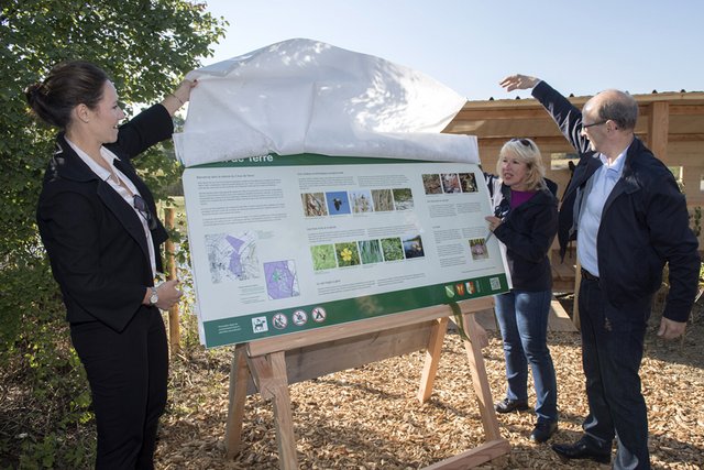 Le directeur de l’OFEV et la cheffe du DTE ont présenté le nouveau système de signalisation des aires protégées, installé dans la réserve du Creux de Terre, à Chavornay.