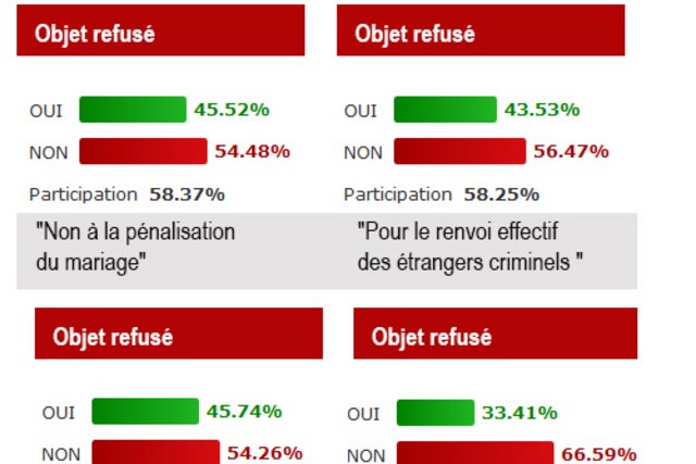 Les Vaudoises et les Vaudois ont rejeté ce dimanche les quatre objets de la votation fédérale. Participation: 58.3%. Le Conseil d'Etat avait également préconisé le rejet de deux objets: pénalisation du mariage et renvoi des étrangers criminels.