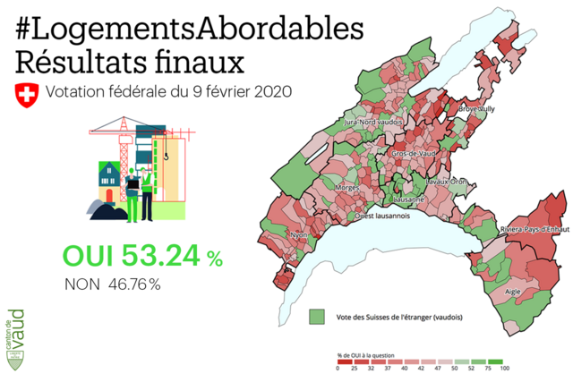 Les Vaudoises et les Vaudois ont dit ce dimanche OUI à l'interdiction de la discrimination en raison de l'orientation sexuelle (80.19%) et OUI à l’initiative pour d’avantage de logements abordables (53.24%).
