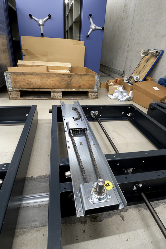 Le dispositif mécanique est intégrés aux châssis. Il rendra possible le déplacement manuel des étagères mobiles. (© ACV, Olivier Rubin)