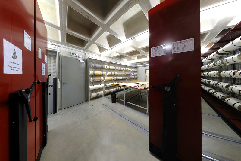 Les plans de grandes dimensions sont placés à la verticale dans des bacs. (cellule 332) (© ACV, Olivier Rubin)