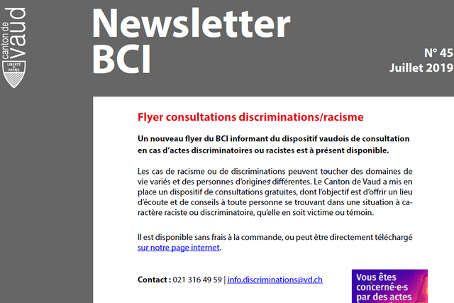 Le Bureau cantonal pour l’intégration des étrangers et la prévention du racisme (BCI) vient de publier un nouveau flyer, informant du dispositif vaudois de consultations gratuites en cas de discriminations ou de racisme.