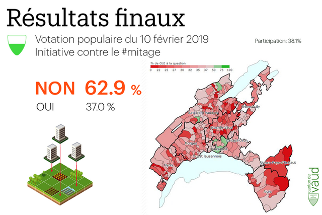 Ce 10 février 2019, la population vaudoise s'est prononcée contre l'initiative "contre le mitage" à 62.9%. La participation était de 38.1%.
