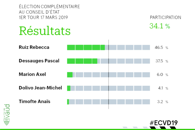 A l'issue de ce 1er tour de dimanche 17 mars 2019, la candidate Rebecca Ruiz arrive en tête (46.59%) suivie par Pascal Dessauges (37.56%). Axel Marion est en 3e position avec 6.03%. Le second tour aura lieu dimanche 7 avril prochain.