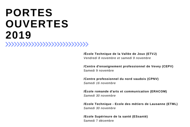 De novembre à décembre, six établissements de formation professionnelle vaudois vont ouvrir leurs portes au public. Les visiteurs pourront découvrir toute la palette des formations professionnelles proposées par ces écoles ainsi que les réalisations d’apprenti-e-s.