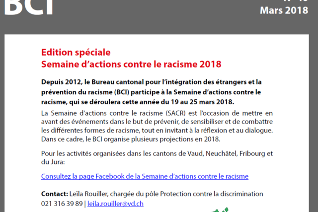 Le Bureau cantonal pour l'intégration des étrangers et la prévention du racisme (BCI) a le plaisir de vous dévoiler ses actualités dans sa newsletter spéciale autour de la Semaine d'actions contre le racisme: