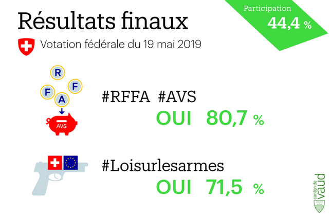 Les Vaudoises et les Vaudois ont dit OUI aux deux objets de la votation fédérale de ce 19 mai 2019: réforme fiscale et financement de l’AVS (RFFA) et directive de l’UE sur les armes. La participation était de 44,4%.