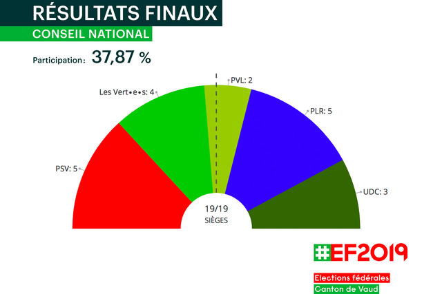 Le 20 octobre, 19 sièges ont été pourvus au Conseil national. Le 2e tour aura lieu le dimanche 10 novembre. Jacqueline de Quattro et Pierre-Yves Maillard sont quant à eux élus au Conseil national.