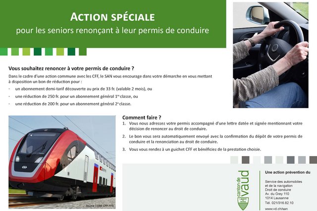 Le Service des automobiles et de la navigation (SAN) reconduit pour une durée indéterminée l’action lancée l’an dernier avec les CFF en faveur des conductrices et conducteurs seniors renonçant spontanément à leur permis de conduire.