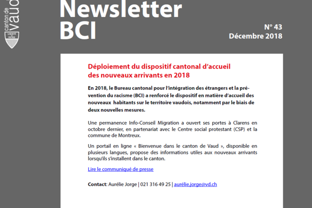 Le Bureau cantonal pour l'intégration des étrangers et la prévention du racisme (BCI) a le plaisir de vous dévoiler ses actualités dans sa newsletter.