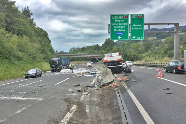 Circulation difficile sur le toboggan de l’A12, entre les sorties de Châtel-St-Denis et de Vevey. Un poids lourd, seul en cause, a percuté les murs en béton séparant les deux chaussées. Des débris son