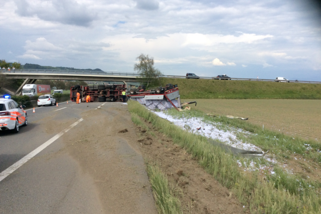 Ce jour, mardi 8 mai 2018, vers 15h45, lors d’un accident de circulation un camion et sa remorque se sont renversés à cheval sur la chaussée et la bordure herbeuse obstruant presque complétement les v