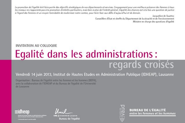 Le Bureau de l'égalité du canton de Vaud, en collaboration avec l'Institut de Hautes études en administration publique (IDHEAP) et le Bureau de l’égalité de l’Université de Lausanne, organise un colloque traitant de l’égalité dans les administrations le 14 juin 2013 à Lausanne.