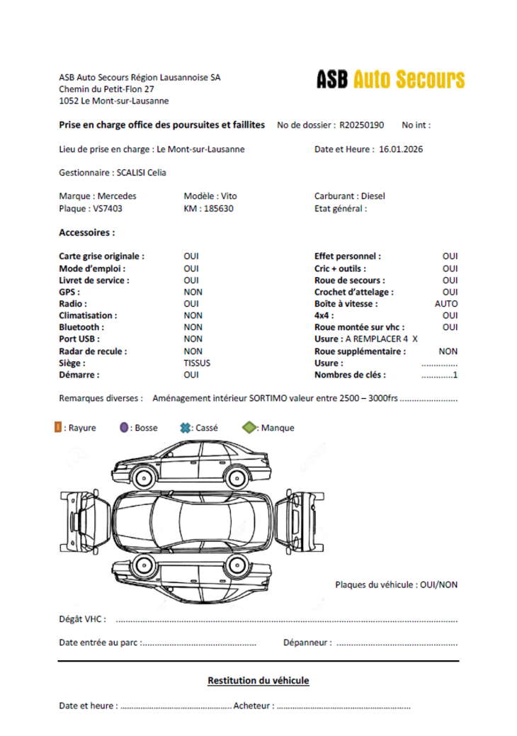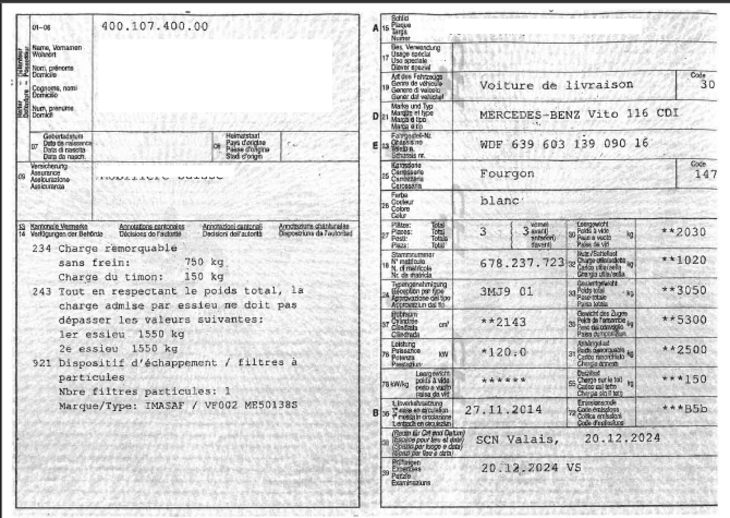Une voiture de marque Mercedes-Benz Vito 116 CDI, première mise en circulation le 27.11.2014, couleur blanc, affichant 185'630 km au compteur, dernière expertise le 20.12.2024, retro abîmé, une clé disponible.