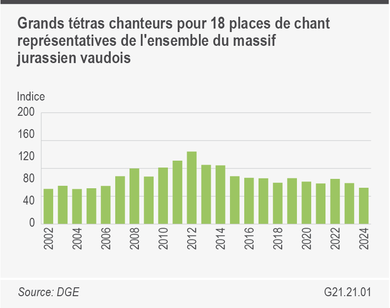 Malgré les mesures de conservation entreprises, l’évolution future des populations de grand tétras demeure incertaine à long terme. Elle dépend de mesures de protection, des efforts dans le domaine du développement territorial ainsi que d’une variable aléatoire liée aux conditions météorologiques.