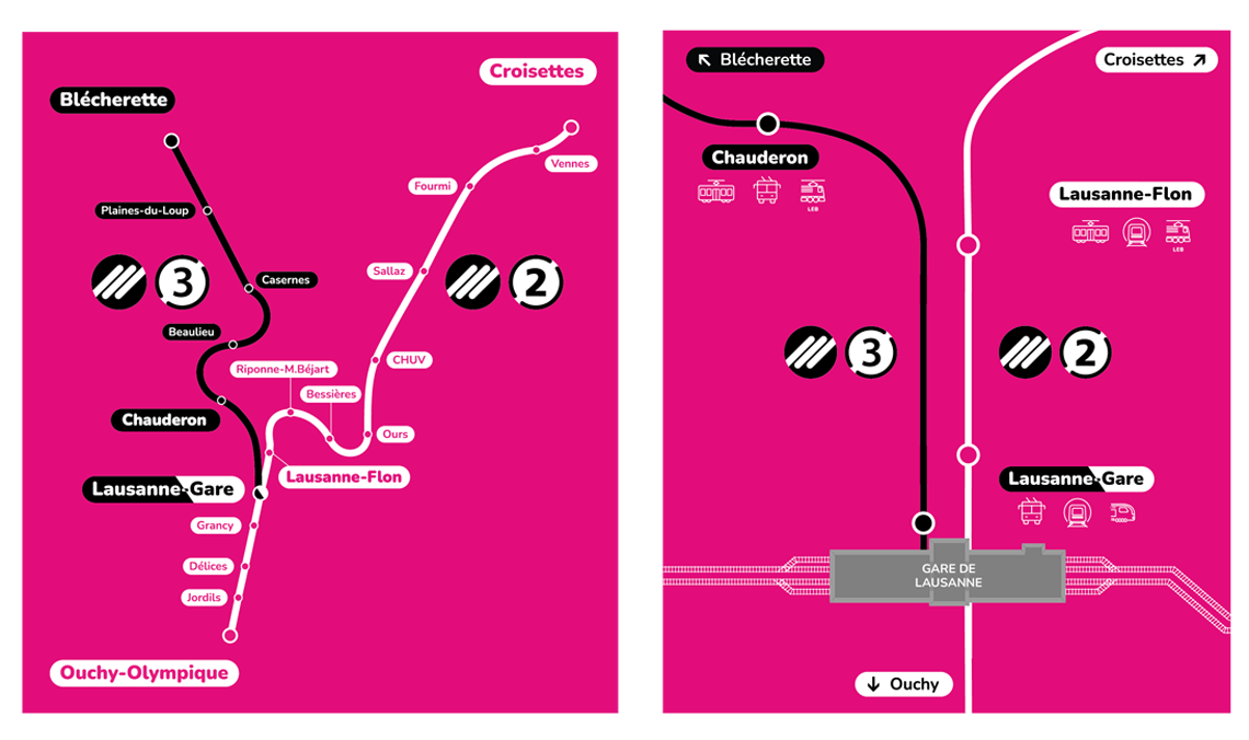 - À Chauderon, connexions au LEB, aux bus, au tram et aux bus dits «à haut niveau de service» (BHNS), c’est-à-dire à grande capacité et prioritaires dans le trafic