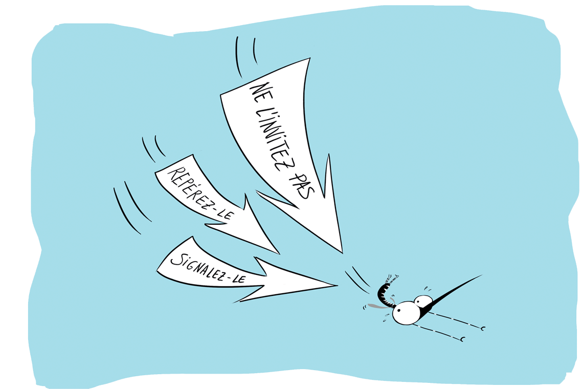 Pour freiner l’installation du moustique et limiter les risques en santé publique : ne l’invitons pas, repérons-le, signalons-le.